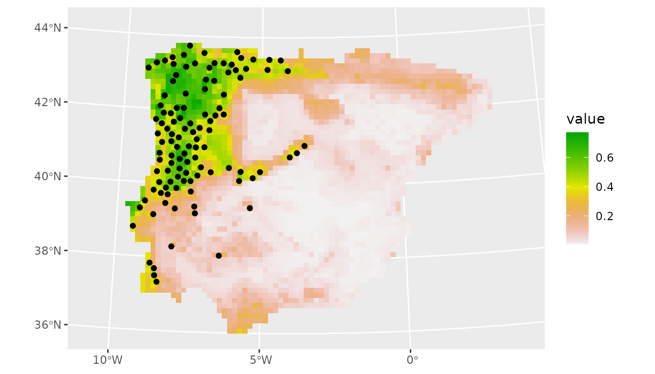 climate_present <- terra::project(climate_present, y = iberia_proj4)And predict the presence of the lizard using the stacked ensemble: